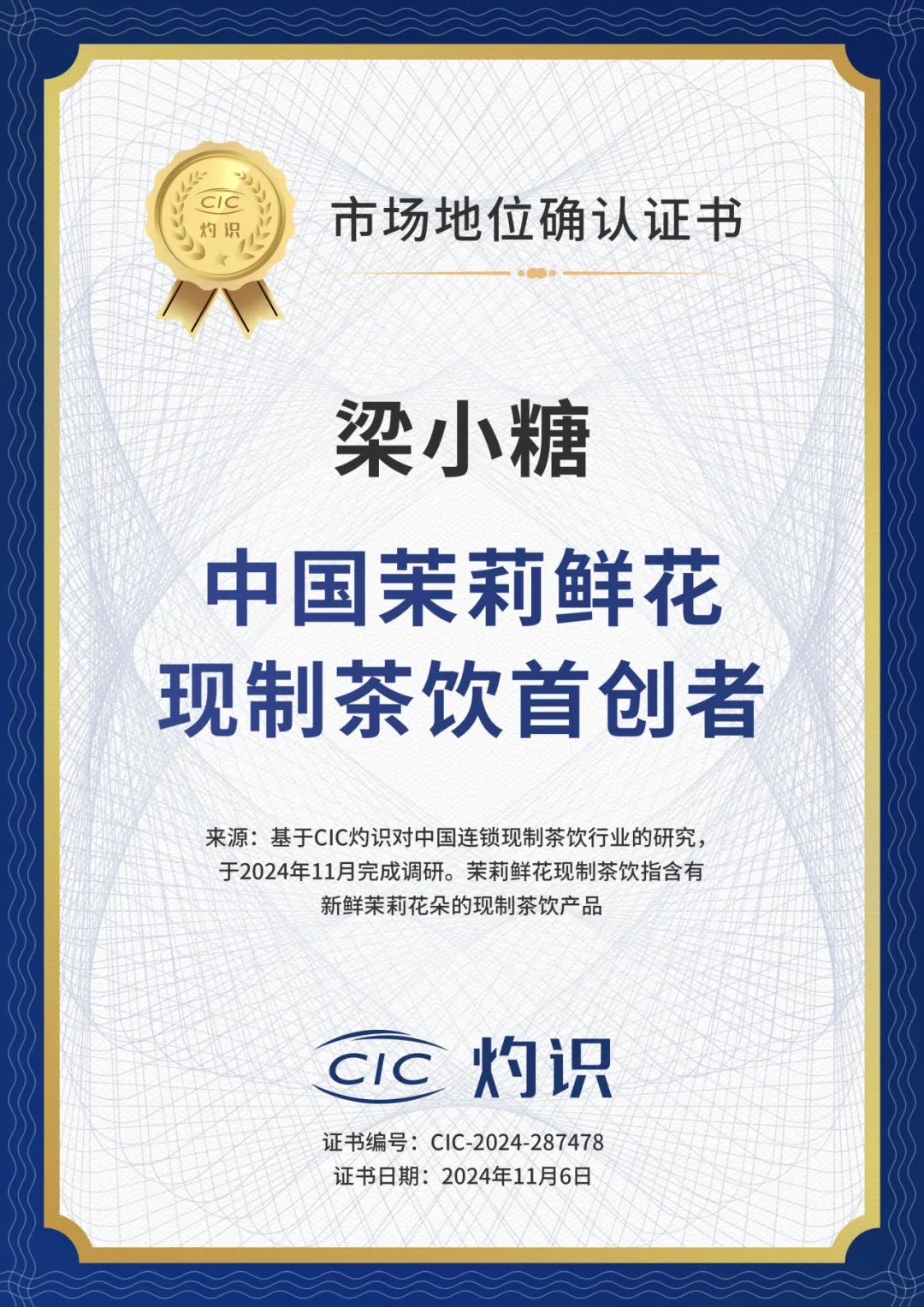在2024年11月期间,CIC灼识就中国连锁现制茶饮行业开展了专项的系统性研究,确认梁小糖 “中国茉莉鲜花现制茶饮首创者”的市场地位。