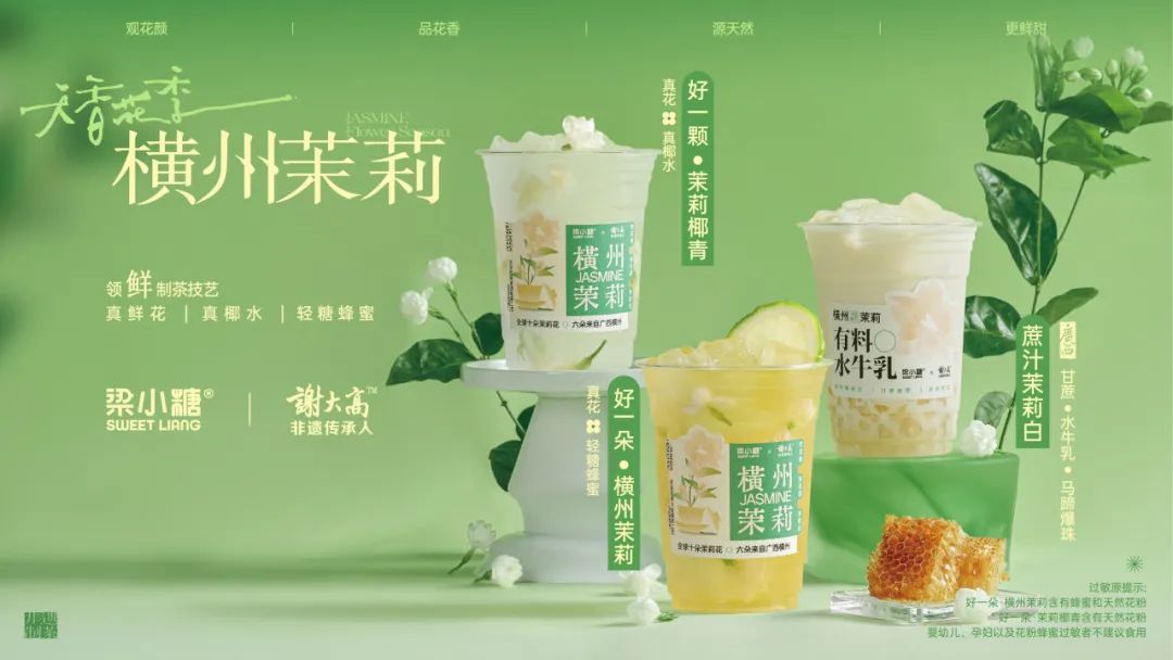 梁小糖的“好一朵·横州茉莉”和“好一颗·茉莉椰青”,采用广西横州当季新鲜茉莉花朵。梁小糖研发团队为寻找最纯净的茉莉花香,往返南宁、横州两地,因花结识广西非遗茉莉花茶制作技艺代表性传承人—谢大高。梁小糖非遗茉莉花茶,就出自谢大师之手。谢大师祖辈传承技艺,四代制茶世家,其采用传统非遗窨花技艺,千朵花窨制成一两茶,才寻得世界无上味。且新鲜茉莉花朵极易凋谢和变质,直接用于奶茶中存在很大难度,因此梁小糖和谢大高团队使用一系列复杂且精细的工序处理。其新鲜茉莉花朵需经过三道水洗以去除杂质,人工挑选确保品质,接着通过UHT超高温瞬时灭菌杀灭微生物及急速冷冻技术,通过现代技术工艺,解决了困扰茶饮行业已久的只能用花酱、干花制作花茶的问题,让顾客喝到高颜值、高情绪价值的鲜花茶,这在现制茶饮行业中是极大的突破与创新。